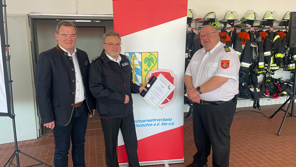 Herr Armin Kappen hat sich in vorbildlicher und ganz außergewöhnlicher Weise um das Feuerlöschwesen verdient gemacht. Die Kreisbrandinspektion wie auch die umliegenden Werk- und Freiwilligen Feuerwehren des Landkreises Pfaffenhofen haben Armin Kappen viel zu verdanken. Es ist mir daher eine wirklich große Ehre und Freude, Herrn Armin Kappen – fast pünktlich zum Eintritt in den Ruhestand- neben unseren besten Wünschen für eine gesunde Rentenzeit, im Namen des Landesfeuerwehrverbandes Bayern und allen hier anwesenden Feuerwehren das Bayerische Feuerwehr – Ehrenkreuz in Gold überreichen zu dürfen.